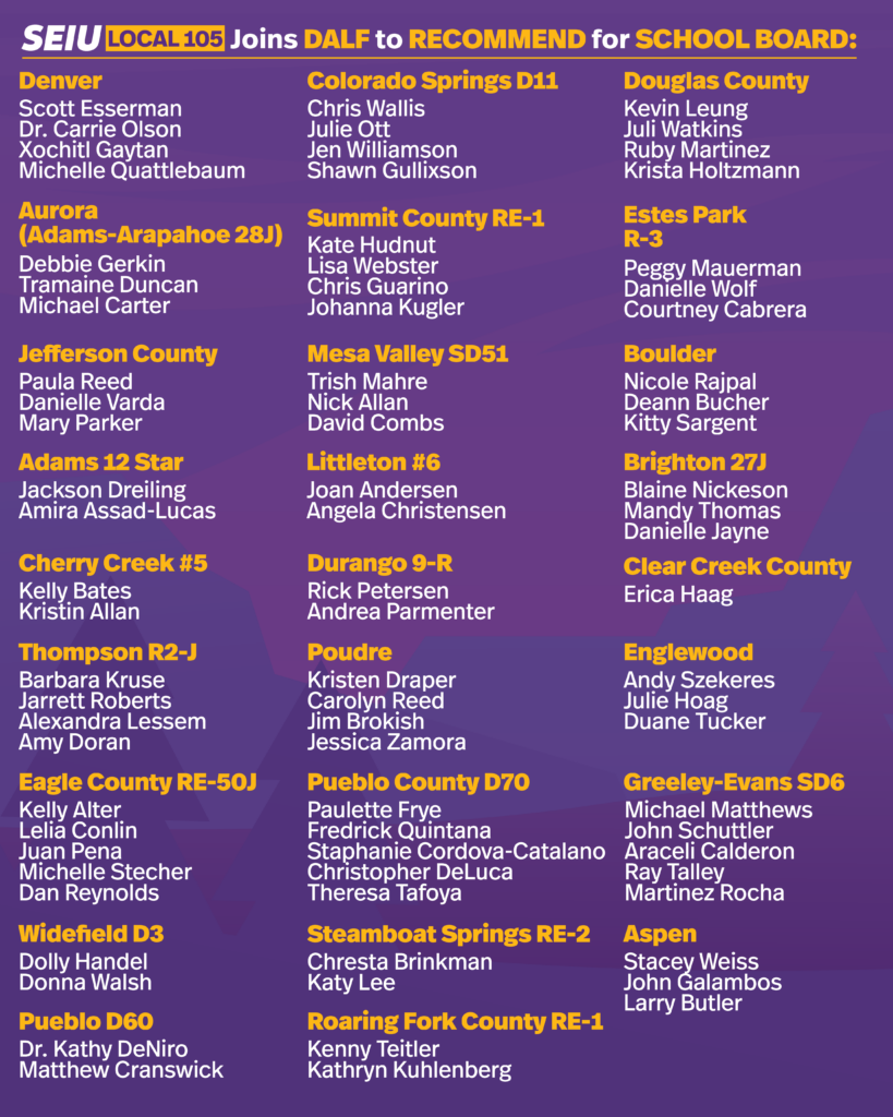 We also have school board elections around Colorado. For so many working families, the decisions made by these school boards have incredible consequences. No matter where we live, our families deserve an accessible and equitable education. That’s why we’re joining the Denver Area Labor Federation (DALF) to RECOMMEND the following candidates for school board around Colorado: