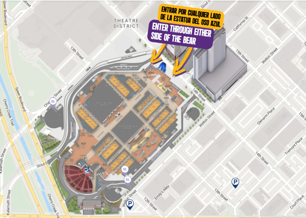 This year, we are proud to support our union janitors and convention center workers by holding our summit at the Colorado Convention Center. Using the map below as reference, you can enter through either side of the blue bear statue using the entrances on 14th Street. We recommend taking the RTD light rail and getting off at Theatre District – Convention Center Station.